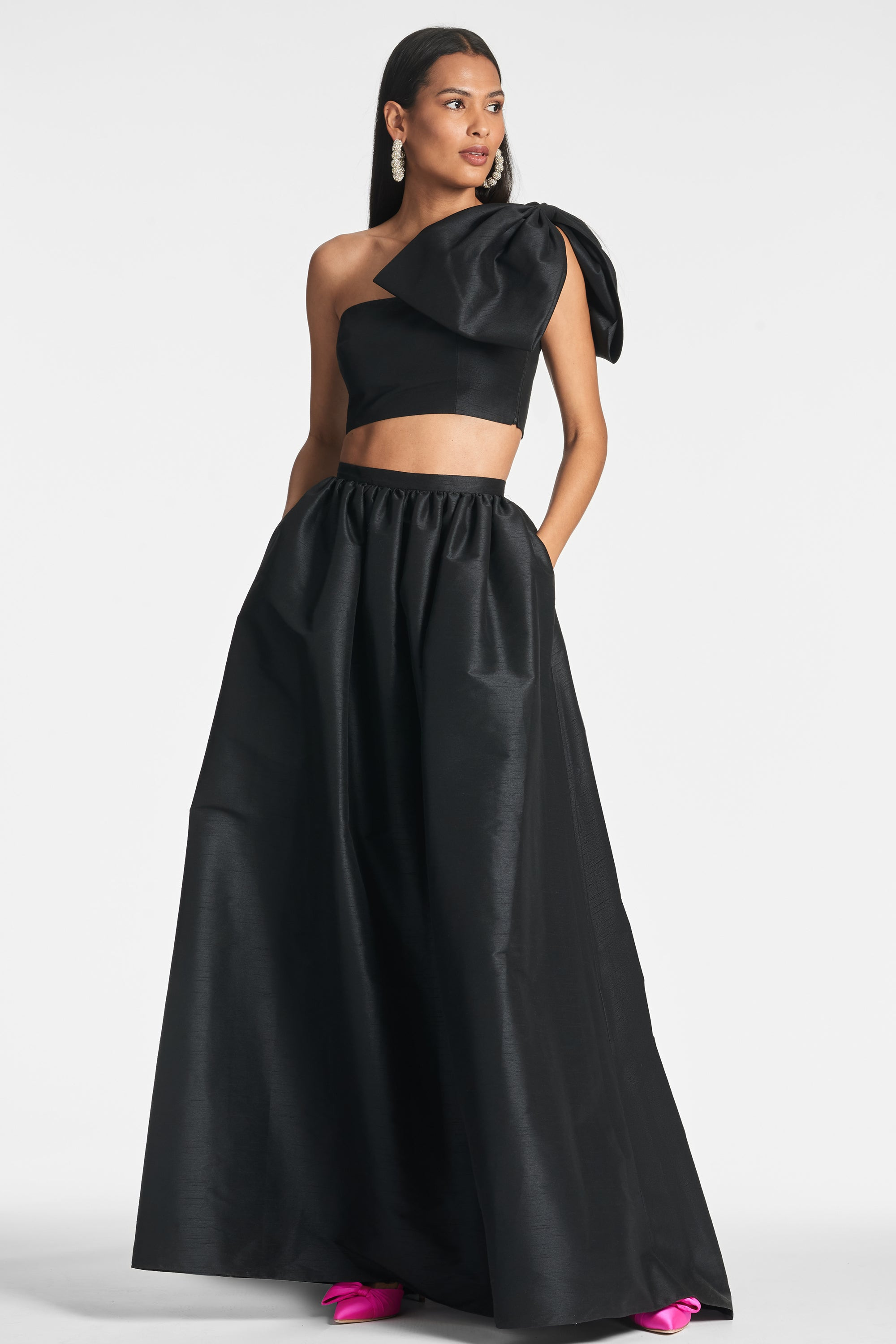 Sydney is the event maxi skirt you've been waiting for. She cinches at the waist and drapes beautifully to form an elegant, classic silhouette. Made of luxurious dupioni fabric, this piece is a wardrobe staple. Pair her back to its matching crop top or the white Astor blouse for a more daytime-friendly look. Details: - Model is 5'11" wearing size 2 - Full-Length, 45" front / 60" back to bottom hem - Back Zipper - Dupioni - 100% Polyester - Imported - Style #S241S02-001