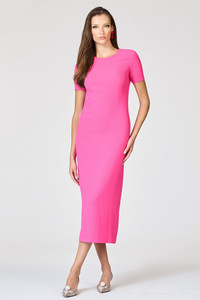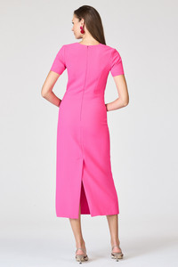 The Tamara Dress in Cerise is a modern study in bold, streamlined elegance. Crafted in a vivid pink hue that demands attention, made with thick stretch crepe fabric, this tailored midi silhouette features a clean jewel neckline and short sleeves for a polished, minimalist effect. The sleek fit skims the body with quiet confidence, while a back vent reveals an unexpected flash of embroidered detail for added intrigue. Perfect for any time of day, it can easily transition you from your desk to dinner. Effortlessly striking, Tamara is designed for occasions that call for confident color and refined sophistication. Details: - Model is 5'10" Wearing A Size 2 - Length of Garment, 47" from top of shoulder to bottom hem - Back Zipper - Full Lining - Thick Stretch Crepe - 92% Polyester 8% Spandex - Imported - Style # F252D11-670