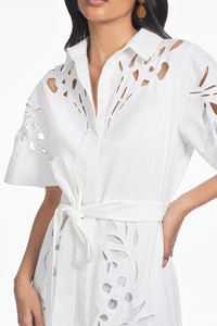 The Vincenza in White is the perfect "White Party" dress, elevated, elegant, and unique. This all-over embroidered shirt-style dress boasts modern design details to balance the classic nature of the silhouette, such as the banded, starched sleeve that holds its shape, drawing contrast to the sleek a-line cut of the dress. Our embroideries are fashioned by our 3rd generation artisans at our family-owned atelier in Mumbai. *Please note this style is produced in a very limited quantity. Details - Model is 5'11" wearing a size S - Length of garment, 49" length on body - Separate slip with adjustable straps - Self-belt - Front placket with S&B buttons - Solid Cotton - 100% Cotton - Imported - Style # T251D07-100