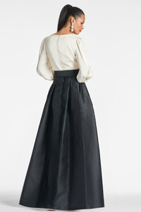 The Zoe Gown is the "Grande Dame" of the occasion. The deep V-neck ivory satin crepe bodice meets the printed Mikado self-belt to join the classic ball skirt with its soft, box pleating. At the front a discreet, but still dramatic, front slit and at each side a side slit pockets. Details: - Model is 5'11" wearing size 2 - Plus-Sized Model is 5'10" wearing size 16W - Full-Length, 60" from top of shoulder to bottom hem - Back Zipper - Silk & Italian Mikado - 100% Polyester - Imported - Style #F221G05-001