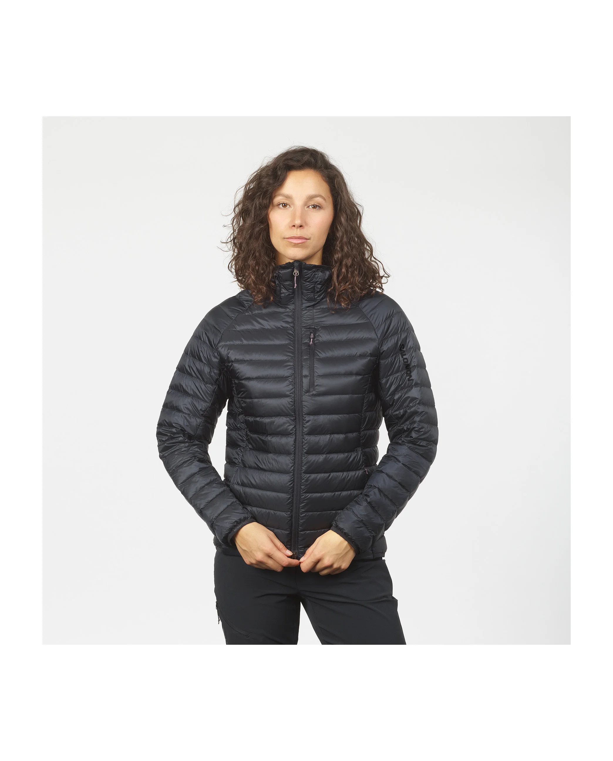 Our women’s Salomon Elixir Micro Down hooded jacket is designed for ultra-light warmth during all your favorite mountain activities. HeiQ XReflex™ technology powered by Xefco and bodymapped 800 fill power down make this one of our lightest and warmest jackets – that’s effortless to pack away. Ready to take on steep paths and powdery slopes. FEATURES & FABRICS - CONCEPT & TECHNOLOGY - HeiQ XReflex™ powered by Xefco: Breathable heat retention using an innovative radiant barrier technology that reflects your body heat back to maintain more warmth with less insulation material. - INSULATION - 800 fillpower: Fill power is a measure of the loft of a down product. The higher the fill power, the more air an ounce of the down can trap, and thus the more insulating ability. - INSULATION - Down insulation 90/10: Down provides more insulation per ounce than any other material, making it the optimal insulator. Our premium 90/10 ratio contains 90% Down and 10% feathers. - HOOD - Fixed hood: The hood is fixed to the garment. - ZIP: Water repellent center front zip - POCKETS - 1 zipped chest pocket: An easy, accessible pocket with secure zip closure. - POCKETS - 2 zipped hand pockets: Roomy pockets to keep your hands warm, with secure, zipped closure. - VISUAL ASPECT - Reflective branding: This item has been designed with reflective inserts. - SUSTAINABILITY: PFC-Free DWR Benefits Breathable, Down insulation, Packable Body lining 100% Polyamide Body 100% Polyamide Hood filling 100% Polyester Body filling 90% Goose down, 10% Goose feather Article ref. LC2108200
