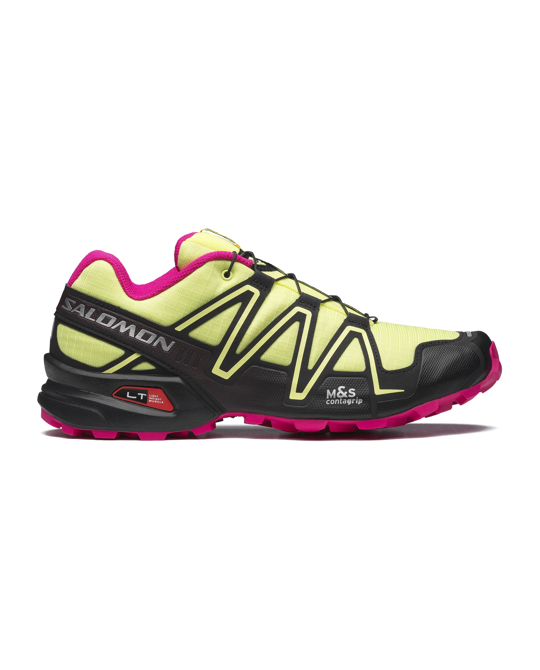 One of Salomon's most iconic shoes, the Speedcross 3 brings big energy to the city with an infusion of fresh colors alongside its instantly recognizable, aggressive lug style for a look that still has no equal. - Drop Value:11 MM - Weight per unit:11 OZ Features & Fabrics Lacing System - quickLACE™ : Minimalistic and strong lace for one-pull tightening. Easy-on, easy-off. Inlay Sole - Textile Lining - Textile Outsole - Rubber Upper - Synthetic / Textile Insole - Molded OrthoLite® sockliner : Molded to match the contours of your foot, this OrthoLite® insole provides superior cushioning, breathability and durability, to upgrade the comfort and performance of your shoe. Lining Fabrics - Textile Lining : A soft, breathable lining for extreme comfort. Material - Synthetic upper : Synthetic upper material provide great durability and protection for outdoor activities. Midsole - Lightweight Muscle : A light but cushy midsole compound. Outsole Type - Mud contaGRIP® : Built for maximum grip on loose, soft, rugged, and uneven surfaces, Mud contaGRIP® uses deep, sharp lugs made from a compound that focuses on adhesion. Upper Construction - Protective Toecap - Lace Pocket : Provides easy storage for the Quicklace™ lacing system. - sensiFIT™ : sensiFIT™ cradles the foot from the midsole to the lacing system, providing a secure, snug, and virtually customized fit all around the foot. - Protective Mudguard : A wrap of leather, synthetic or rubber around the base of the foot that protects the lateral and medial sides of the foot. - Feather Construction : A construction that extends the upper material over the midsole, to create a super-precise wrap of the foot and improve the feel. Article ref.L49147800