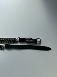 Rare piece from Balmain’s Autumn Winter 2009 collection under Christophe Decarnin. Features a polished silver curb chain interwoven with black calfskin leather, finished with an adjustable leather strap and buckle closure. As seen in the lookbook and campaign. this belt captures the bold, rock & punk infused aesthetic that defined Decarnin’s era. Made in France. Size: One Size Total length 40,5 inches / 103 cm Perfect condition