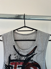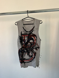 Iconic Balmain by Christophe Decarnin tank from the iconic Spring Summer 2011 collection. Made in France, this piece embodies Decarnin’s rebellious punk-rock vision for the house with raw deconstructed edges and bold graphic elements. The front features aggressive graffiti-style artwork including a tiger, serpent, and abstract forms in black and red. The standout detail is the use of safety pins holding the side seams together, with both sides of the tank literally pinned shut, adding to the raw DIY aesthetic. Subtle distressed hem and neckline throughout. As soon on Beyonce Tagged size 40FR, fits like men’s S. Perfect vintage condition