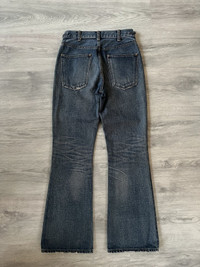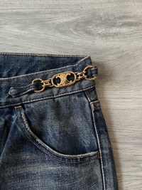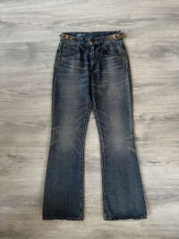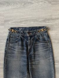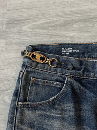 CELINE W_FL_008 Dylan flare jeans in a rich blue wash, crafted in Japan with exceptional attention to detail. These jeans feature a flattering flared silhouette with elegant front seam lines and a subtle faded finish that adds depth and texture. The standout detail is the iconic gold Triomphe buckle chain integrated at the waistband, giving a refined yet edgy touch that’s distinctly CELINE. Premium Japanese denim ensures structure and durability while maintaining a soft feel. A rare piece that blends classic denim styling with luxury house codes. Perfect for elevating casual looks or pairing with tailored pieces. Size 27 US. Perfect condition, no visible signs or traces of use.
