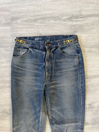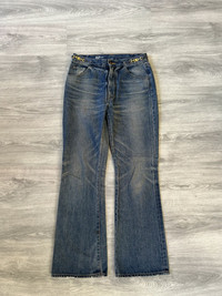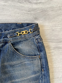 CELINE W_FL_018 Dylan flare jeans in a rich blue wash, crafted in Japan with exceptional attention to detail. These jeans feature a flattering flared silhouette with elegant front seam lines and a subtle faded finish that adds depth and texture. The standout detail is the iconic gold Triomphe buckle chain integrated at the waistband, giving a refined yet edgy touch that’s distinctly CELINE. Premium Japanese denim ensures structure and durability while maintaining a soft feel. A rare piece that blends classic denim styling with luxury house codes. Perfect for elevating casual looks or pairing with tailored pieces. Size 29 US Perfect vintabe condition, no major signs or traces of use.
