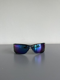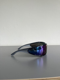 Dior by John Galliano fly sunglasses, a standout archival accessory from the early 2000s, famously worn by Kylie Jenner and emblematic of the futuristic, high-gloss aesthetic Galliano brought to Dior’s eyewear line. Featuring a wraparound shield design, these sunglasses are built with a sleek, semi-transparent grey frame that flows seamlessly into a single mirrored lens. The lens reflects shades of deep blue and violet, shifting in tone depending on the light and angle, and subtly enhances the aerodynamic silhouette. The Dior logo is prominently printed on both temples and repeated on the lens, adding layered branding without disrupting the smooth, sculptural shape. Size: One Size Condition: great vintage condition with no major flaws. Made in Italy Only one on the market