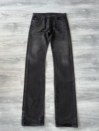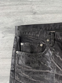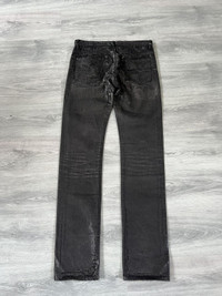 Exceptional pair of Dior Homme by Hedi Slimane denim jeans from the Autumn/Winter 2003 collection, known as "Luster." These jeans feature a distinctive waxed finish and the signature clawmark distressing, capturing the signature raw, rock inspired aesthetic of Slimane’s tenure at Dior Homme. Made in Japan, these jeans showcase the impeccable craftsmanship and attention to detail the brand is known for. With a sleek, slim fit, these jeans are a rare and iconic piece of fashion history. Don’t miss the opportunity to own one of the most sought after Dior Homme pieces. Size 31, see measurements. Unaltered length In great condition with no noticeable flaws. Wax is greatly intact.