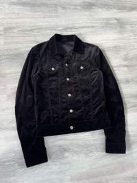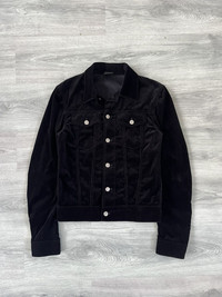 Black velvet corduroy jacket from Dior Homme’s Spring/Summer 2019 collection under Kim Jones. Made in Italy with branded Dior Homme hardware and the signature shoulder darts that define the line. Slightly cropped body with elongated sleeves, crafted from a lightweight soft velvet corduroy with two chest pockets and adjustable tabs at the waist. Size 44 IT, fits mens S In great condition, has minor signs of wear. Nothing major.