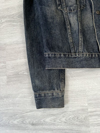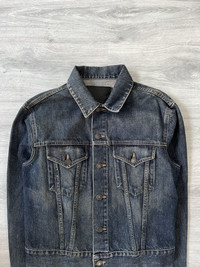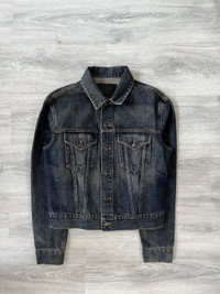 From Tom Ford’s Spring/Summer 2002 Gucci collection. Cropped and boxy fit, made from midweight Italian denim in a dark indigo wash with subtle fading and whiskering. Features pointed chest pockets, vertical seams, and branded button closure. Clean back with tonal stitching, adjustable waist tabs & slightly elongated sleeves. Size 46 IT / 42 FR. Fits cropped men’s S/M or womens M/L Perfect vintage condition