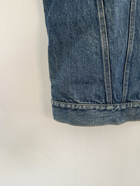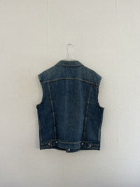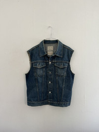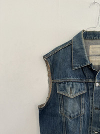 Helmut Lang piece from the 90’s. Made in Italy from high quality blue denim with a clean, structured fit. Classic trucker style design but sleeveless, minimal, sharp, and very versatile. Features a button up front, two chest pockets, and signature seam detailing. The wash is a rich dark indigo with subtle fading throughout. Great for layering Size 48 - M or slim large 9/10 condition, no noticeable flaws Made in Italy