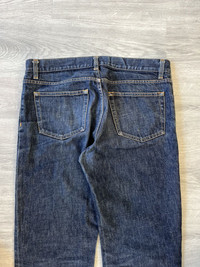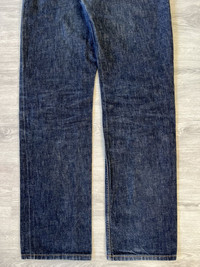 Helmut Lang 1998 blue indigo classic cut denim jeans made in Italy. Straight leg fit with mid rise. Features five pocket construction, button fly, and Helmut Lang branded hardware. Deep indigo wash with minimal fading. Size 34, unaltered length Perfect vintage condition, no major flaws. See pictures