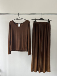 (INCLUDE TOP + PANTS) For sale is an Issey Miyake Mainline Iridescent Longsleeve and Pants Set, made in Japan. The fabric has a unique iridescent quality that shifts between different brown tones depending on the light. The top features a rounded neckline, long sleeves, and a relaxed fit that drapes elegantly. The simple design is enhanced by the fabric’s texture and sheen. The pants have a loose, flowing fit with an elastic waistband for comfort and flexibility. Both items are size M Perfect vintage condition, kept carefully