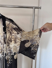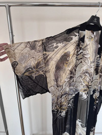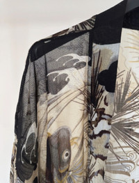 Insanely rare piece from Jean Paul Gaultier’s 1990s Soleil collection. Made from JPG’s signature lightweight polyamide-mesh fabric, this kimono style robe features an all over intricate koi fish and wave print inspired by traditional Japanese art. Sheer, breathable, and drapes beautifully. Hard to come by, especially in this condition. Size S, stretches up to as twice as big, so could probably fit Excellent vintage condition Made in Italy
