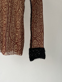 Paisley printed mesh top with an open knit mohair trim. It features the signature JPG loop at the back, and mohair flat-stitch detailing across. Made in Italy by Fuzzi. Size S, can stretch up to as twice as big. Perfect vintage condition
