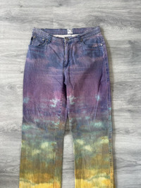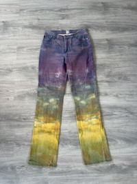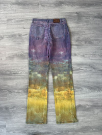Rare vintage piece from Just Cavalli’s Autumn Winter 2010 collection. These jeans feature an all over sunset sky print that fades from deep purples and blues at the top into vivid yellows and greens toward the hem, capturing the surreal beauty of a horizon at dusk. A standout example of Cavalli’s experimental approach to denim during this era. Classic five pocket construction with a straight leg cut. Soft mid weight denim with a comfortable fit. Great for anyone looking to add a artistic statement piece to their wardrobe. Size 32 9/10 condition, as good as new Made in Italy