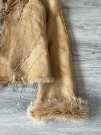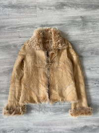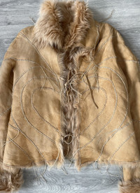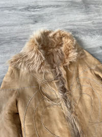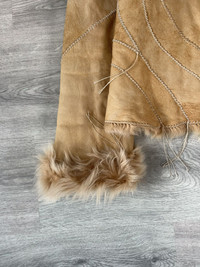 This FW2003 Roberto Cavalli jacket blends plush leather with sumptuous fur accents, creating a tactile harmony of textures. The warm beige hue serves as a versatile canvas, while the fur trim adds depth and an inviting softness. Tailored to perfection, the jacket offers a flattering fit that echoes classic yet adventurous style. That's such a crazy rare item. Note: the jacket is slightly more lighter in colour than it appears on camera. Tagged size L Fits women L or men’s S. In very good condition for its age, no major flaws. Kept well
