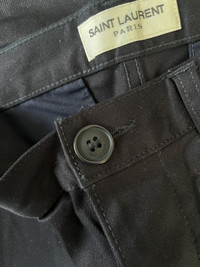 Clean and classic Saint Laurent Paris trousers from the 2019 collection. Crafted from high quality cotton in a deep navy black tone, offering a sleek and versatile look. Slim, tailored fit with minimal detailing – a staple piece with the refined edge Saint Laurent is known for. By Anthony Vaccerello Made in Italy. Size: 33 Condition: Excellent, no noticeable flaws or signs of wear Great for both casual and dressed up styling.