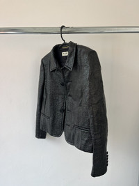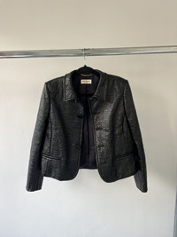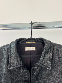 For sale is an Autumn Winter 2013 Saint Laurent Paris single breasted jacket designed by Hedi Slimane. Crafted in France from a black coated cotton-blend tweed, this piece is a standout from Slimane’s early era at the house, blending sharp tailoring with a raw edge. The structured silhouette features padded shoulders, a notched collar, two front welt pockets, and a single-button closure. The coated tweed finish gives it a subtle sheen and modern texture, setting it apart from classic tailoring staples. Fully lined and expertly constructed. Size: Womens 42. In perfect condition, has 2 buttons that close perfectly. No visible flaws or signs of use.