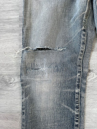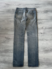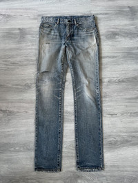 Saint Laurent Paris D02 denim from 2019. This pair features a perfectly worn-in light wash with authentic distressing and subtle repaired detailing throughout, most notably on the thigh and knee. Classic five-pocket construction with a slim tapered fit that defines the iconic D02 silhouette. Made in Japan from premium Japanese denim with incredible texture and fading. Size 32 US. Unaltered length Great condition, no major flaws. A professional repair was done on the crotch