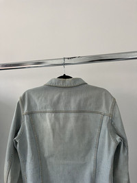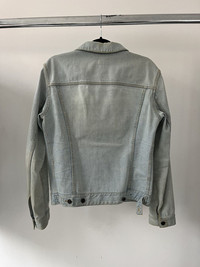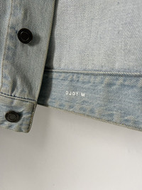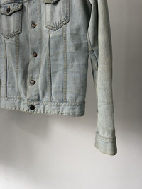 Iconic Saint Laurent Paris denim jacket from the Spring Summer 2014 collection, designed by Hedi Slimane. Features a vintage-inspired light wash with a perfectly worn-in look, signature of Slimane’s rock-influenced aesthetic during his tenure at the house. Beautiful fading and subtle distressing throughout. Slim tailored fit with buttoned chest pockets, side waist adjusters, and contrast stitching. Made in Italy. Tagged size L, fits M/L Great condition, all the wear is intentional. Button on the back is missing, no hinders while wearing. Easy fix. See photo