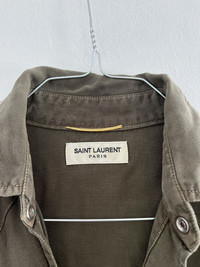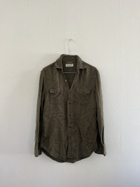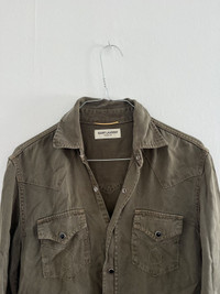 Western khaki flannel shirt from Saint Laurent’s Autumn/Winter 2015 collection under Hedi Slimane. Made in Japan from midweight, soft flannel with a worn in wash. Features include snap button closure, pointed western yoke and dual flap chest pockets. Slim fit with a curved hem, perfect for layering or wearing on its own. Size S 8.5/10 condition, theres slight traces of discoloration. Adds character to those who like that. Not noticeable when worn, especially if you like hemming the sleeves. Made in Japan