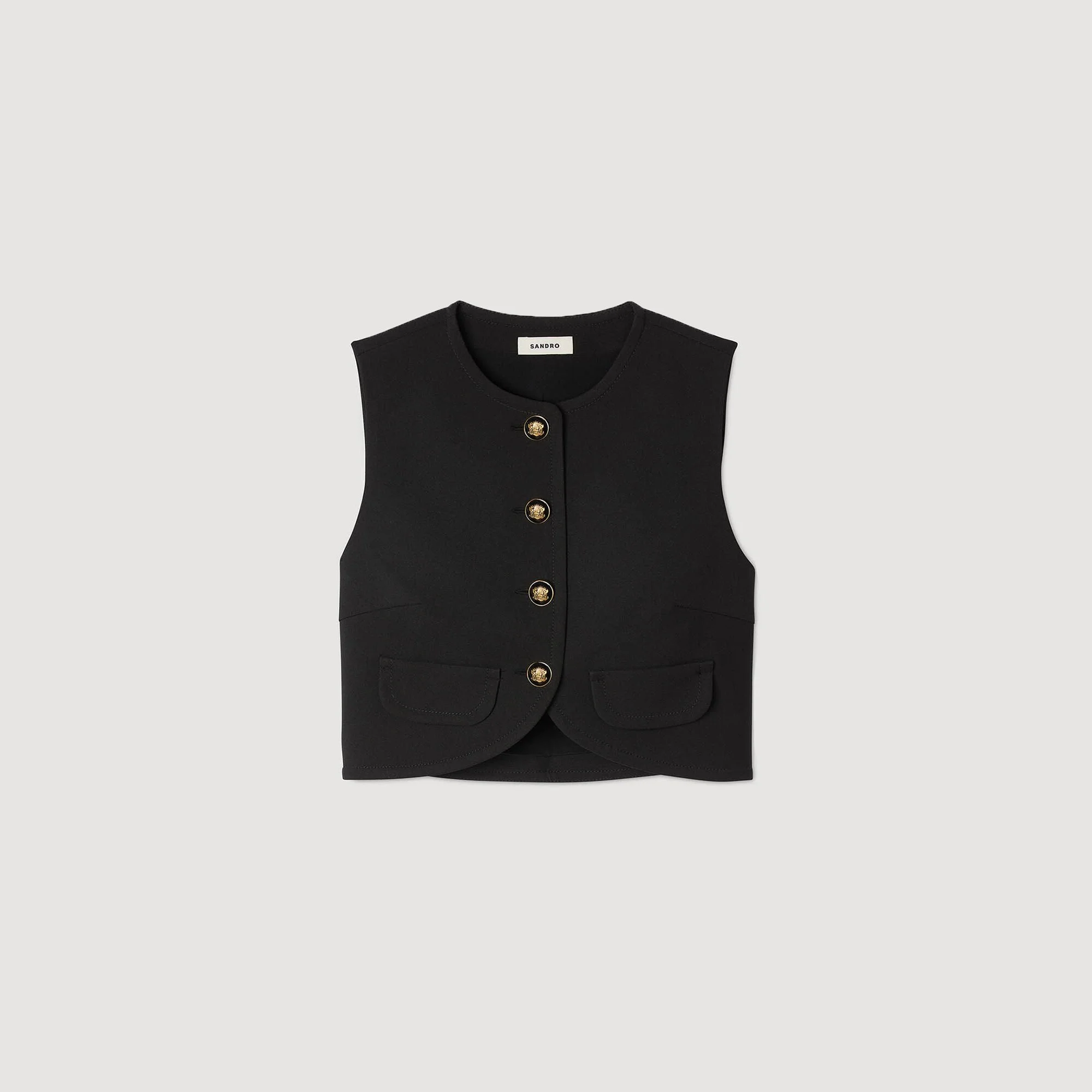 Sleeveless fine knit crop top with a button fastening at the front, round neck, flap patch pockets and a rounded hem at the front. - Sandro Women's plain crop top - Sleeveless - Round neck - Button fastening at the front - Flap patch pockets - Designed for a cropped fit Reference: SFPTO00817_20 COMPOSITION & CARE Composition - Main material: 91% polyester, 9% elastane - Lining: 100% polyester Care advice - Do not wash - Do not bleach - Do not tumble dry - Iron at a maximum temperature of 110°C without steam - F/ - Professional dry clean, with hydrocarbon solvent, gentle treatment