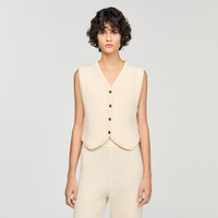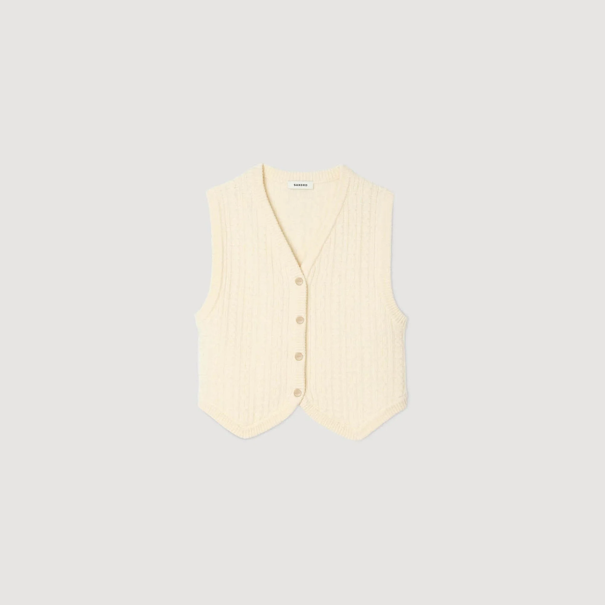 Cable knit vest with a V-neck and button fastening. - Sandro Women's sleeveless vest - V-neck - Front button fastening - Fine knit - Ribbed trim - True to size Reference: SFPCA01332_11 COMPOSITION & CARE Composition - Main fabric: 96% wool, 4% polyamide - Rib: 100% wool Care advice - Hand wash - Do not bleach - Do not tumble dry - Iron at a maximum temperature of 110°C without steam - F - Professional dry clean, with hydrocarbon solvent, normal treatment