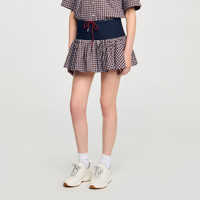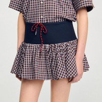 Skort with a plain band and drawstring waist, featuring a small check ruffle at the hem. - Sandro Women's check skort - High waist - Flared - Decorative drawstring - Side zip fastening - Designed for a flared fit This skirt matches the Reference: SFPSH00550_G023 COMPOSITION & CARE Composition - Main material: 99% cotton, 1% elastane - Secondary material: 100% cotton Care advice - Do not wash - Do not bleach - Do not tumble dry - Iron at a maximum temperature of 110°C without steam - F/ - Professional dry clean, with hydrocarbon solvent, gentle treatment