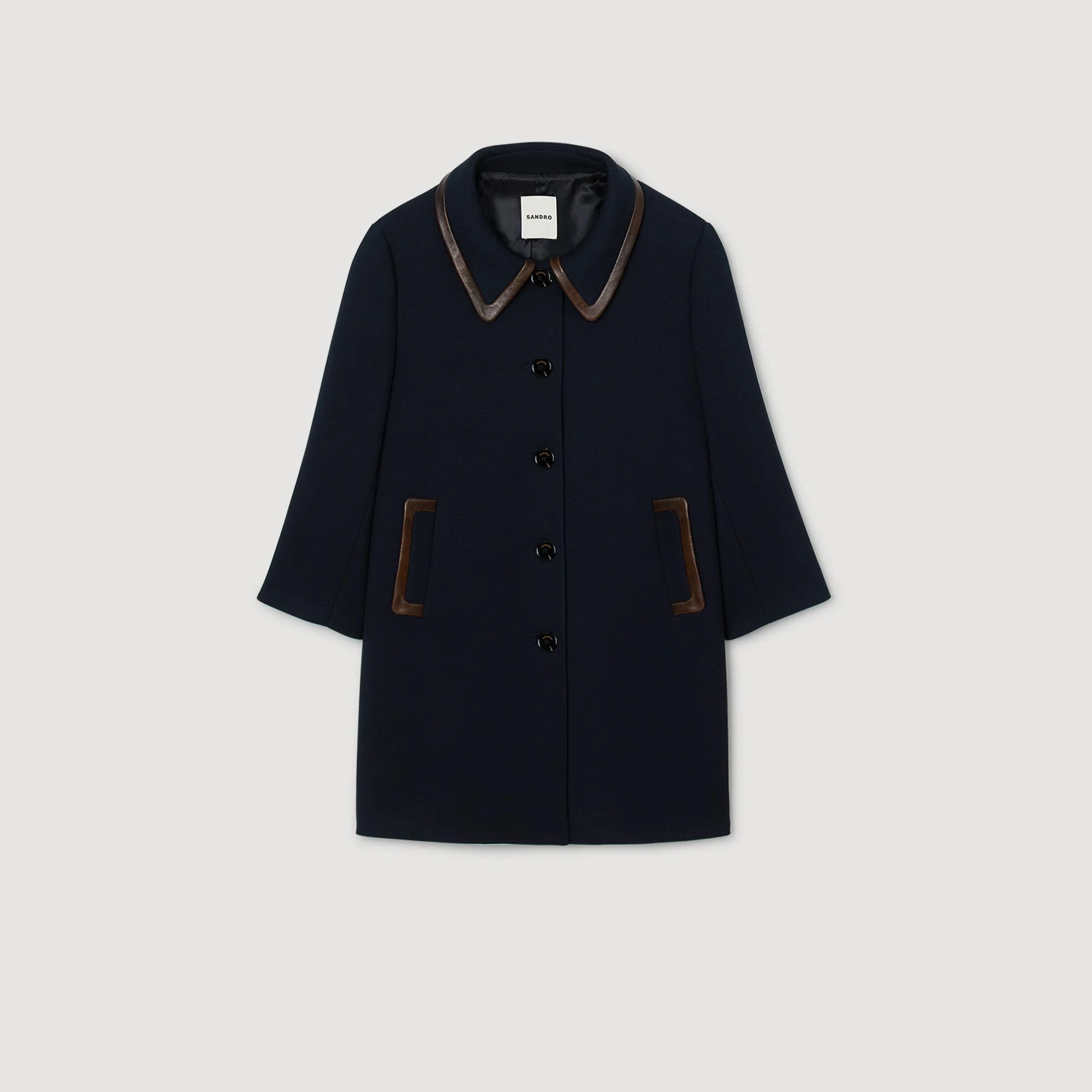 Straight coat with shirt collar, long sleeves and button fastening, featuring contrasting leather bands. - Sandro Women's coat with leather panels - Large piping at the front - Lined - Button placket fastening - Designed for a boxy fit Reference: SFPOU00718_44 COMPOSITION & CARE Composition - Main material: 64% polyester, 34% viscose, 2% elastane - Lining: 100% viscose - Band: 100% lamb - Pocket lining: 100% cotton Care advice - Do not wash - Do not bleach - Do not tumble dry - Do not iron - F/ - Professional dry clean, with hydrocarbon solvent, gentle treatment