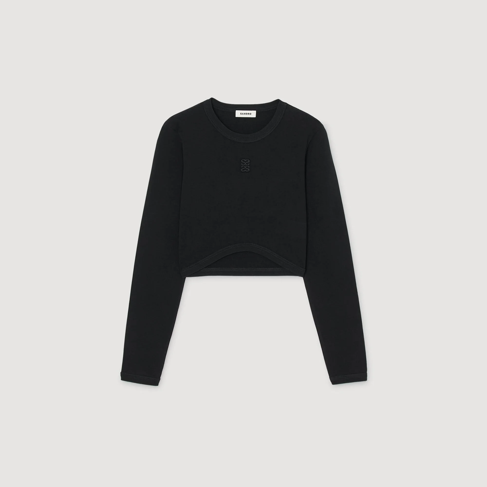 Cropped cotton T-shirt with round neck, long sleeves and tone-on-tone embroidery. - Sandro Women's cropped T-shirt - Round neck - Long sleeves - Tone-on-tone embroidery - Ribbed edges - Shorter in front - Designed for a cropped fit Reference: SFPTS01733_20 COMPOSITION & CARE Composition - Main material: 95% cotton, 5% elastane - Rib: 100% cotton Care advice - Gentle cycle 30° - Do not bleach - Do not tumble dry - Iron at a maximum temperature of 110°C without steam - Do not dry clean