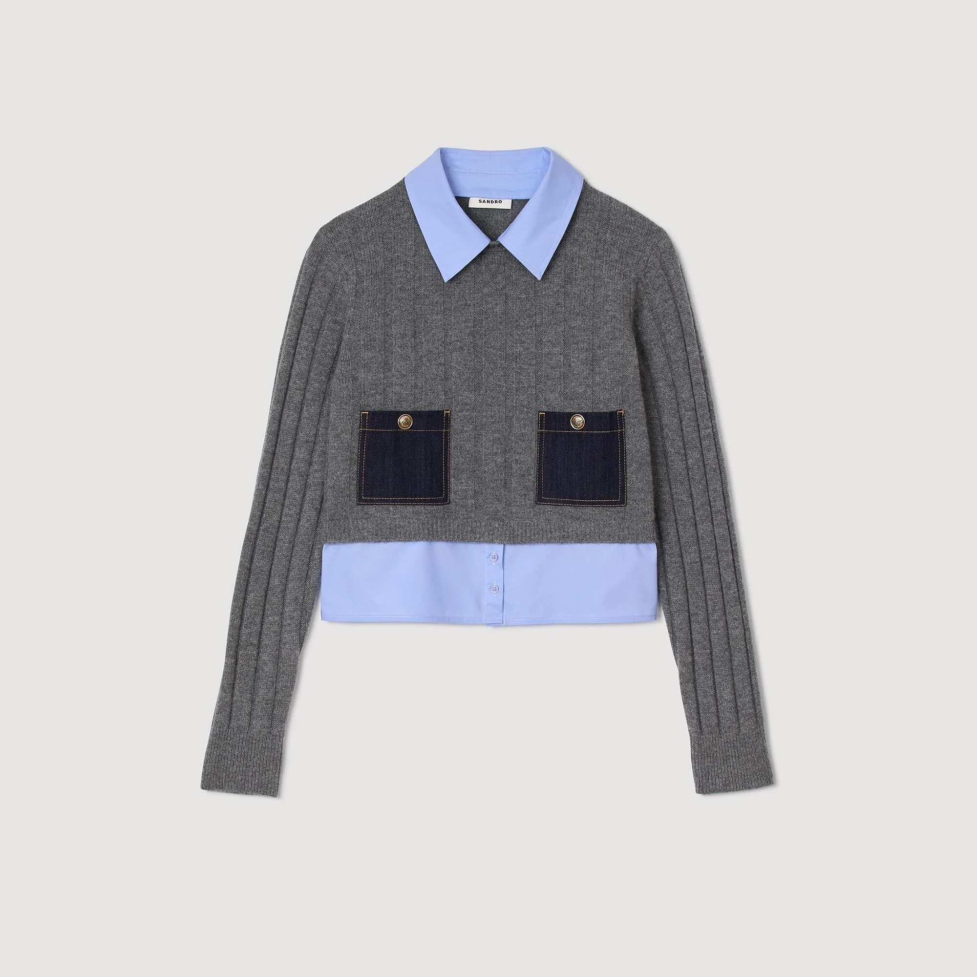 Cropped wool and cashmere knit sweater with shirt panels, long sleeves and denim patch pockets. - Sandro Women's knitted wool and cashmere sweater - Contrasting shirt collar - Long sleeves - 2 denim patch pockets with buttons - Shirt hem - Cropped fit Reference: SFPPU02315_24 COMPOSITION & CARE Composition - Main fabric: 92% wool, 8% cashmere - Pocket: 100% cotton - Secondary fabric: 100% cotton - Removable collar: 100% cotton - Rib: 87% cotton, 8% cashmere, 4% polyamide, 1% elastane Care advice - Hand wash - Do not bleach - Do not tumble dry - Iron at a maximum temperature of 110°C without steam - F - Professional dry clean, with hydrocarbon solvent, normal treatment
