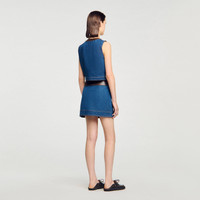 Cropped denim top with contrasting leather trim at the neckline and placket, with buttoned patch pockets and a button fastening. - Sandro Women's cropped denim and leather top - Sleeveless - Button fastening - Buttoned patch pockets - Round neck - Washed denim - Designed for a cropped fit Reference: SFPTO00833_470 COMPOSITION & CARE Composition - Main material: 100% cotton - Leather: lambskin leather Care advice - Do not wash - Do not bleach - Do not tumble dry - Do not iron - F/ - Professional dry clean, with hydrocarbon solvent, gentle treatment