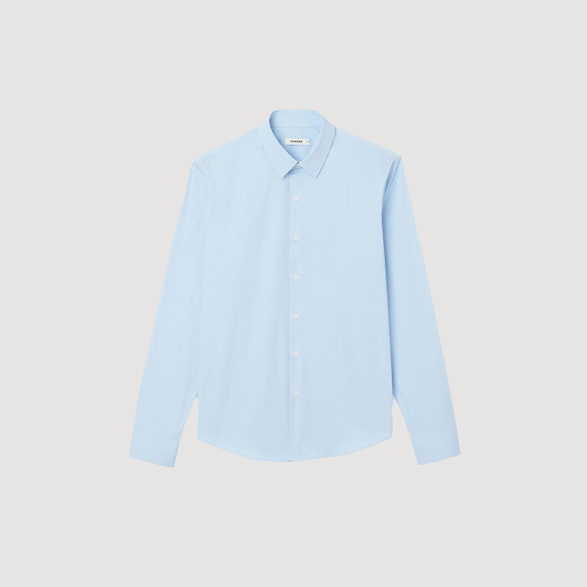 Fitted stretch cotton shirt with long sleeves, buttoned cuffs, a classic collar, and a button fastening. Sandro Men's stretch cotton shirt Fitted cut Long sleeves Buttoned cuffs Button fastening Model is wearing a size S and is 6'2'' The model is 189 cm / 6'2 tall and wears a size S / 8 UK COMPOSITION Main fabric: 78% cotton, 18% polyamide, 4% elastane Buttons: 100% vegetable ivory Reference: SHPCM00858_40