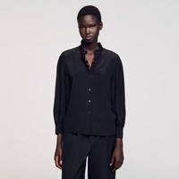 Floaty silk shirt with ruffled collar, smocked front and shoulder gathers and long sleeves with buttoned cuffs. Sandro Women's floaty silk shirt Ruffled V-neck Long sleeves with button cuffs Button fastening The model is 178 cm / 5'10 tall and wears a size 1 FR / S COMPOSITION Main fabric: 100% silk Buttons: 100% nacre Reference: SFPCM01233_20