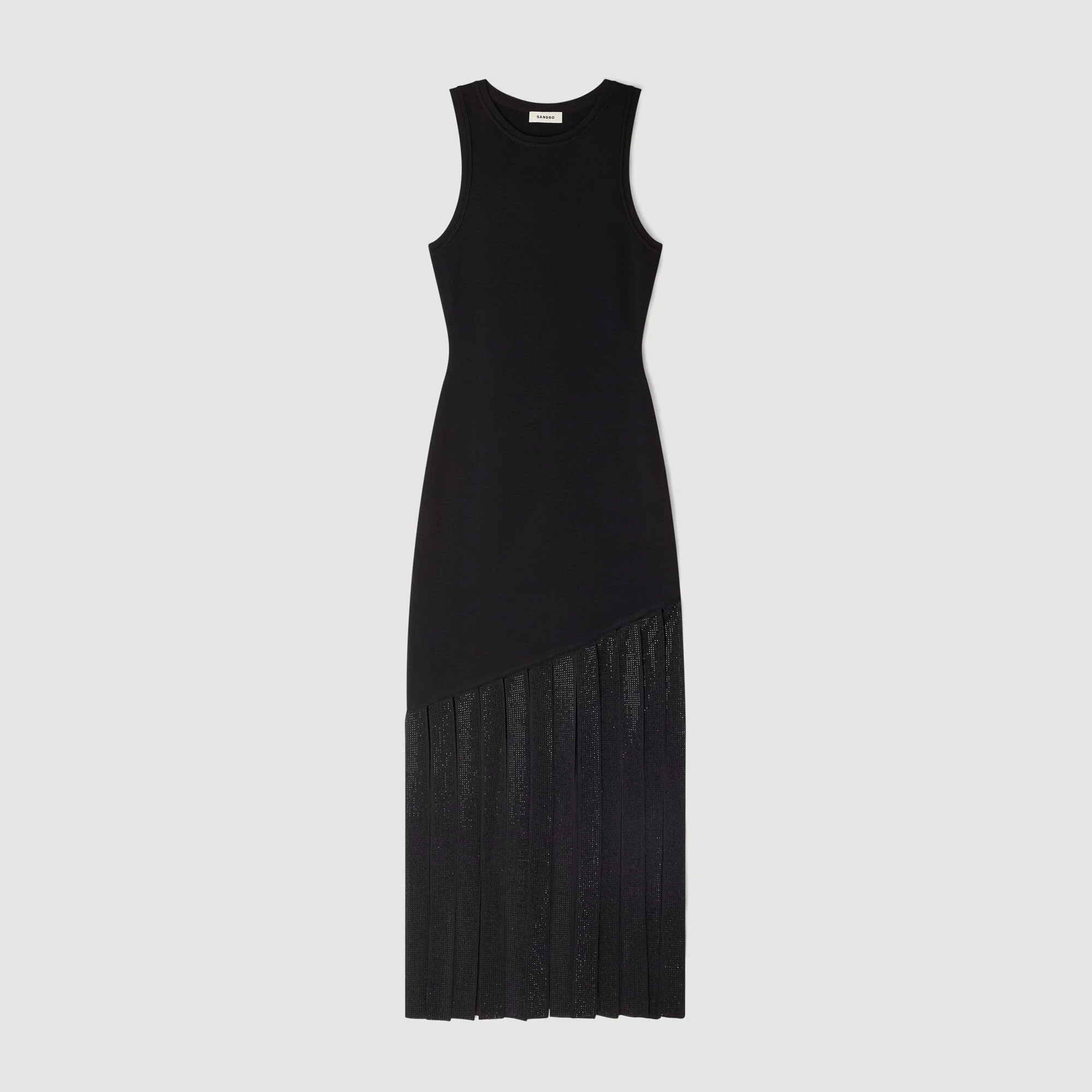 Sleeveless knit maxi dress adorned with wide tone-on-tone rhinestone fringes at the bottom. - Sandro Women's knit dress - Round neck - Sleeveless - Rhinestone fringes - Designed for a slim fit Reference: SFPRO04481_20 COMPOSITION & CARE Composition - Main fabric: 76% viscose, 21% polyamide, 3% elastane - Fringing: 100% viscose Care advice - Hand wash - Do not bleach - Do not tumble dry - Iron at a maximum temperature of 110°C without steam - F - Professional dry clean, with hydrocarbon solvent, normal treatment