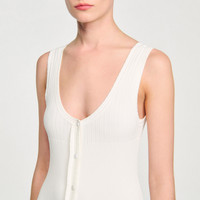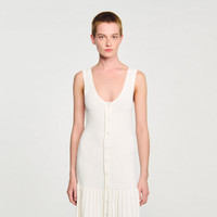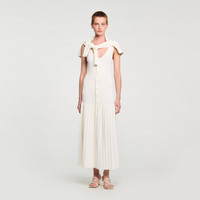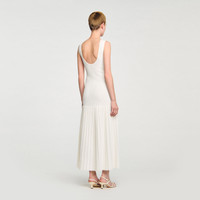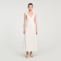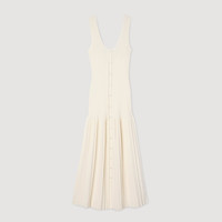 Maxi knit dress with straps, a press-stud fastening and a flared pleated-effect skirt. - Sandro Women's maxi knit dress - Thin straps - Flared pleated-effect skirt - Front button fastening - Designed for a flared fit Reference: SFPRO04435_11 COMPOSITION & CARE Composition - Main fabric: 51% viscose, 47% polyamide, 2% elastane - Band: 52% viscose, 46% polyamide, 2% elastane Care advice - Hand wash - Do not bleach - Do not tumble dry - Iron at a maximum temperature of 110°C without steam - F - Professional dry clean, with hydrocarbon solvent, normal treatment