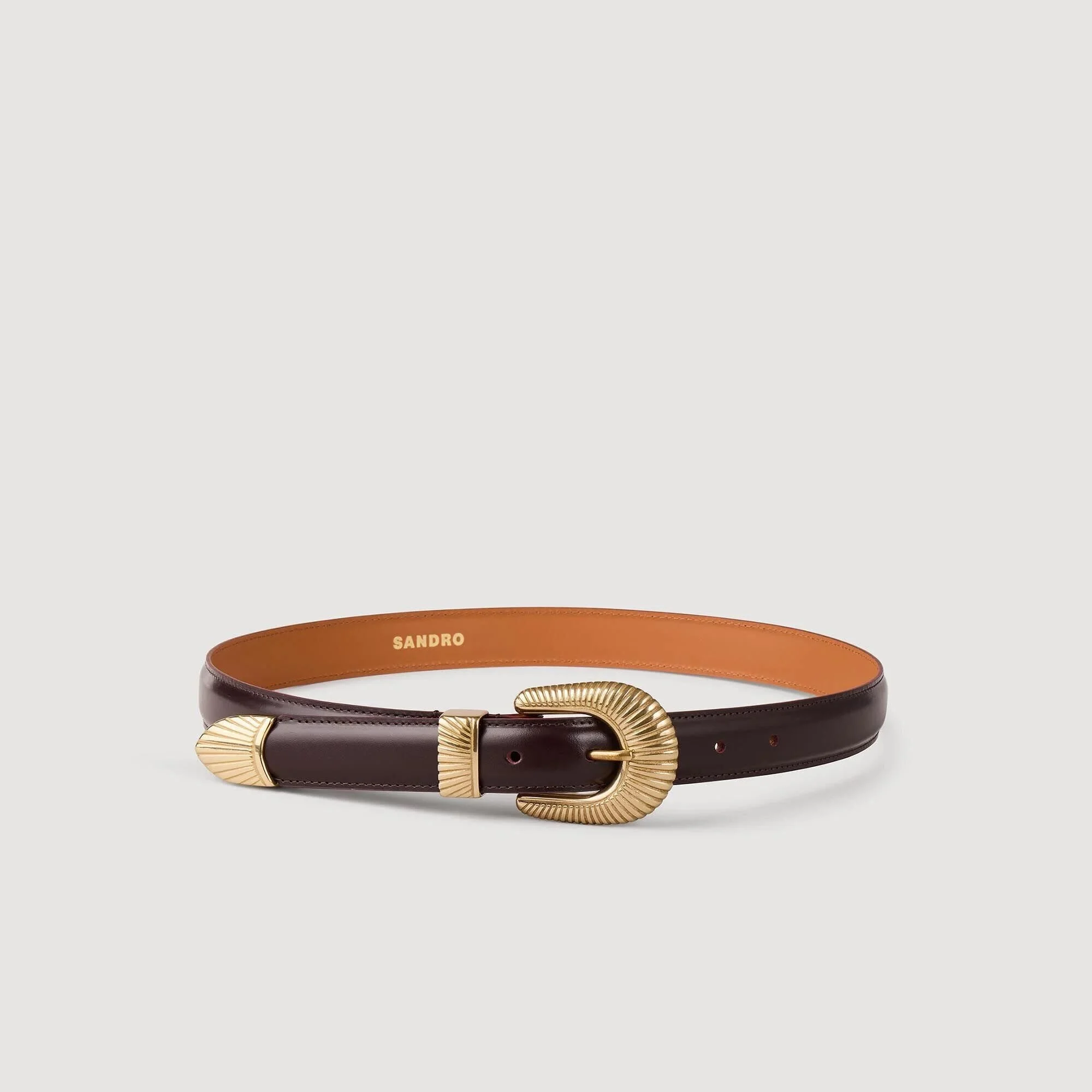 Leather belt with adjustable gold-tone tooled metal buckle. Sandro Women's leather belt Adjustable buckle Tooled gold-tone metal buckle and end tip COMPOSITION Leather: cow Lining: cow Reference: SFACE00410_34