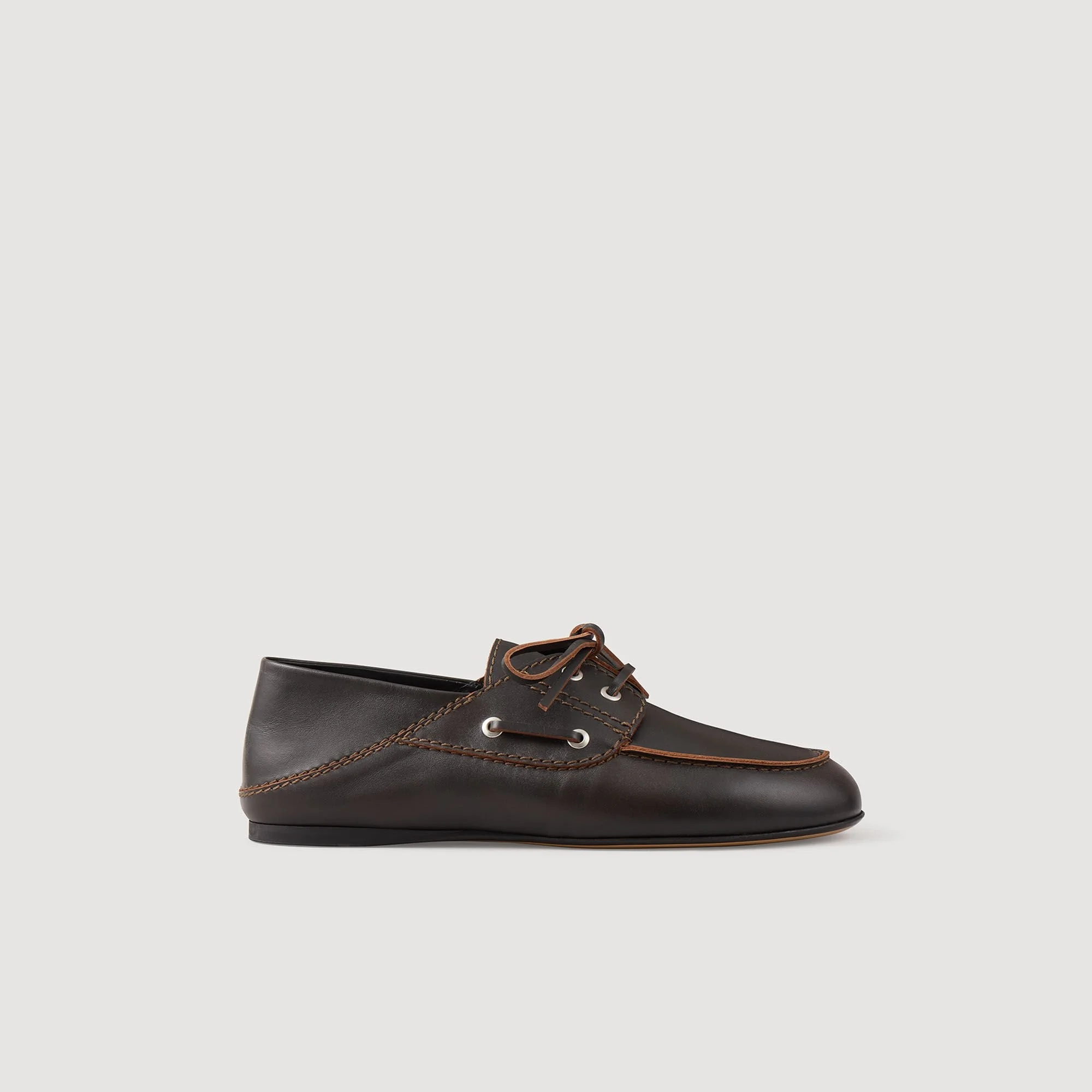 Plain leather boat shoe-style loafers with decorative laces and folding heel counter so they fit like mules. - Sandro Women's boat-style loafers - Plain leather - Foldable counter COMPOSITION & CARE Main material: cow leather Lining: cow leather Sock lining: cow leather Outer sole: cow leather