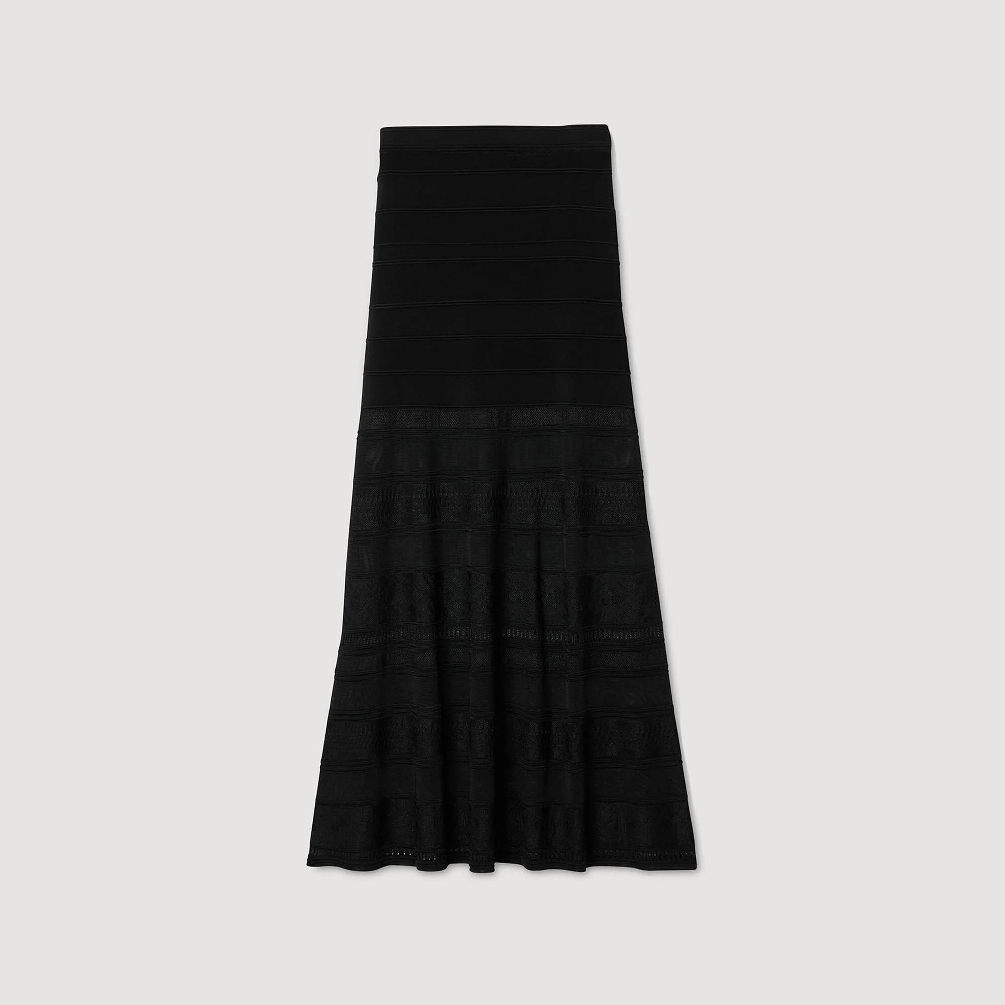 Decorative stitch maxi skirt, fitted at the waist and slightly flared at the bottom. - Sandro Women's maxi knitted skirt - Decorative stitch - Fitted waist - True to size This skirt matches this Reference: SFPJU01408_20 COMPOSITION & CARE Composition - Main fabric: 82% viscose, 16% polyamide, 2% elastane - Secondary fabric: 100% viscose - Band: 87% viscose, 11% polyamide, 2% elastane Care advice - Hand wash - Do not bleach - Do not tumble dry - Iron at a maximum temperature of 110°C without steam - F - Professional dry clean, with hydrocarbon solvent, normal treatment