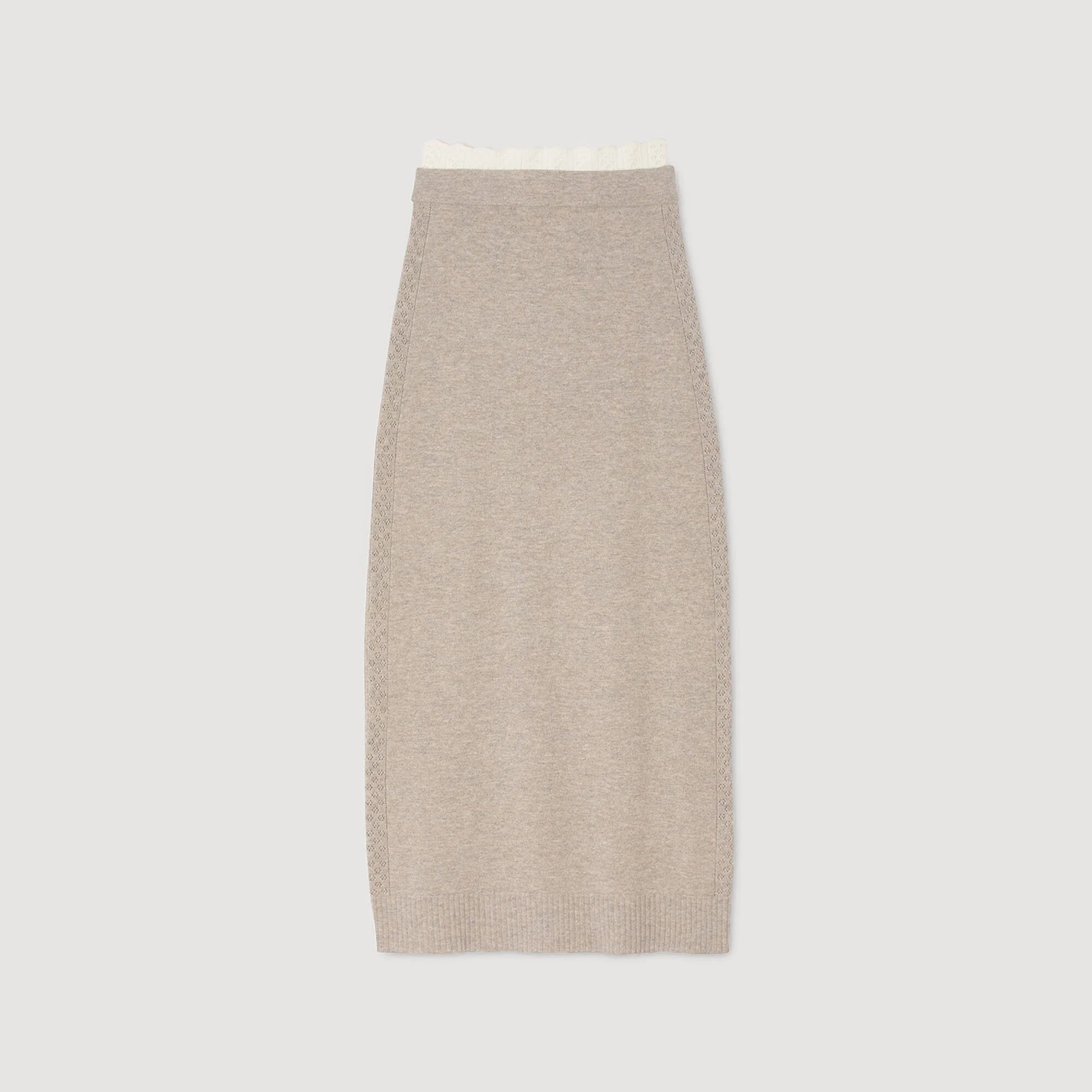 Maxi knit skirt with contrasting pointelle knit waistband. - Sandro Women's maxi knit skirt - Contrasting waistband - Fine knit - High waist - Straight cut - True to size Reference: SFPJU01543_72 COMPOSITION & CARE Composition - Main fabric: 90% wool, 10% cashmere - Secondary fabric: 62% viscose, 22% polyester, 14% polyamide, 2% elastane - Rib: 83% wool, 9% polyamide, 7% cashmere, 1% elastane Care advice - Hand wash - Do not bleach - Do not tumble dry - Iron at a maximum temperature of 110°C without steam - F - Professional dry clean, with hydrocarbon solvent, normal treatment