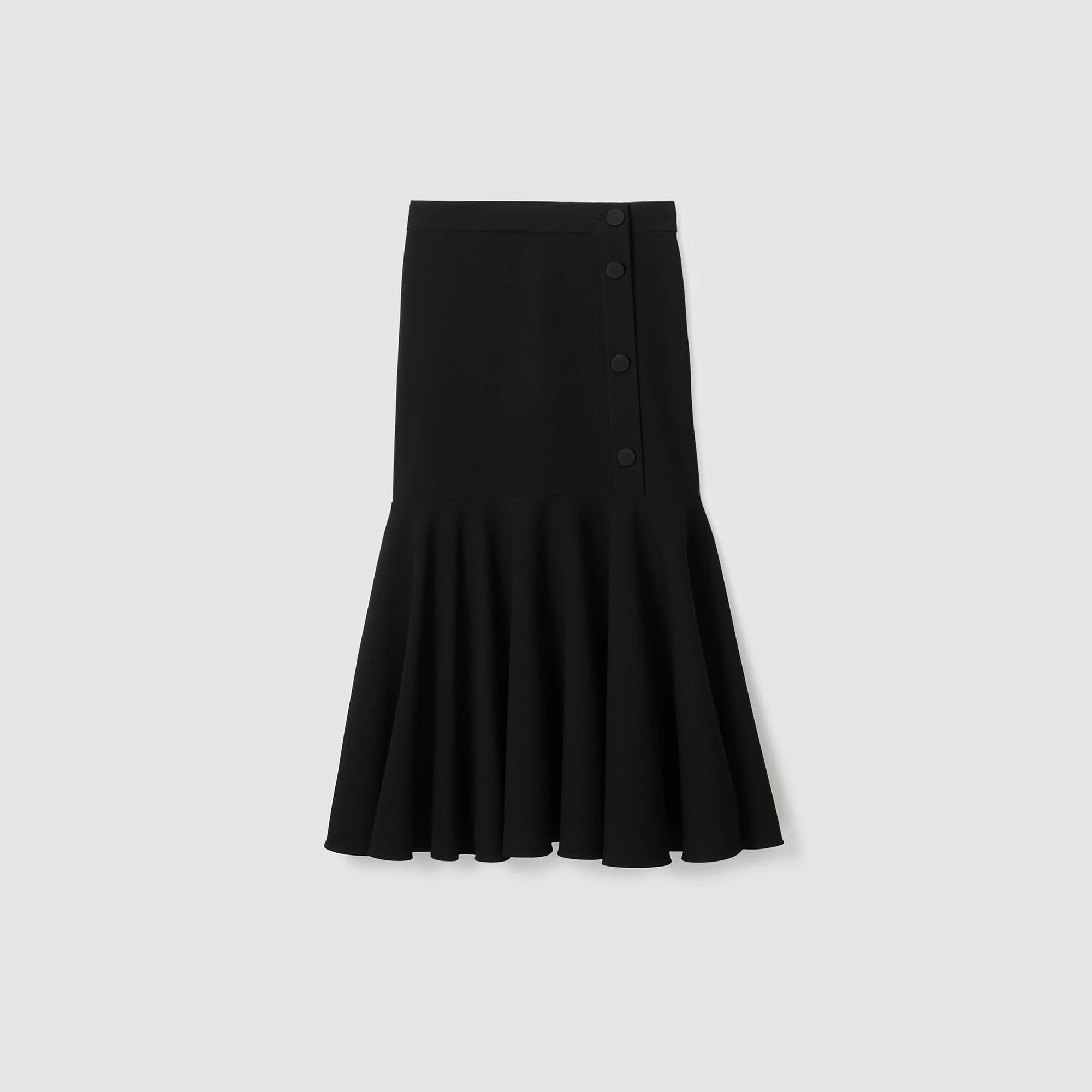 Midi flared skirt with ruffles and decorative buttons on the side. - Sandro Women's midi flared skirt - Decorative buttoning - Ruffled skirt - High waist - Zip fastening - Designed for a flared fit Reference: SFPJU01558_20 COMPOSITION & CARE Composition - Main material: 64% polyester, 32% viscose, 4% elastane - Bias binding: 100% polyester Care advice - Do not wash - Do not bleach - Do not tumble dry - Iron at a maximum temperature of 110°C without steam - F/ - Professional dry clean, with hydrocarbon solvent, gentle treatment