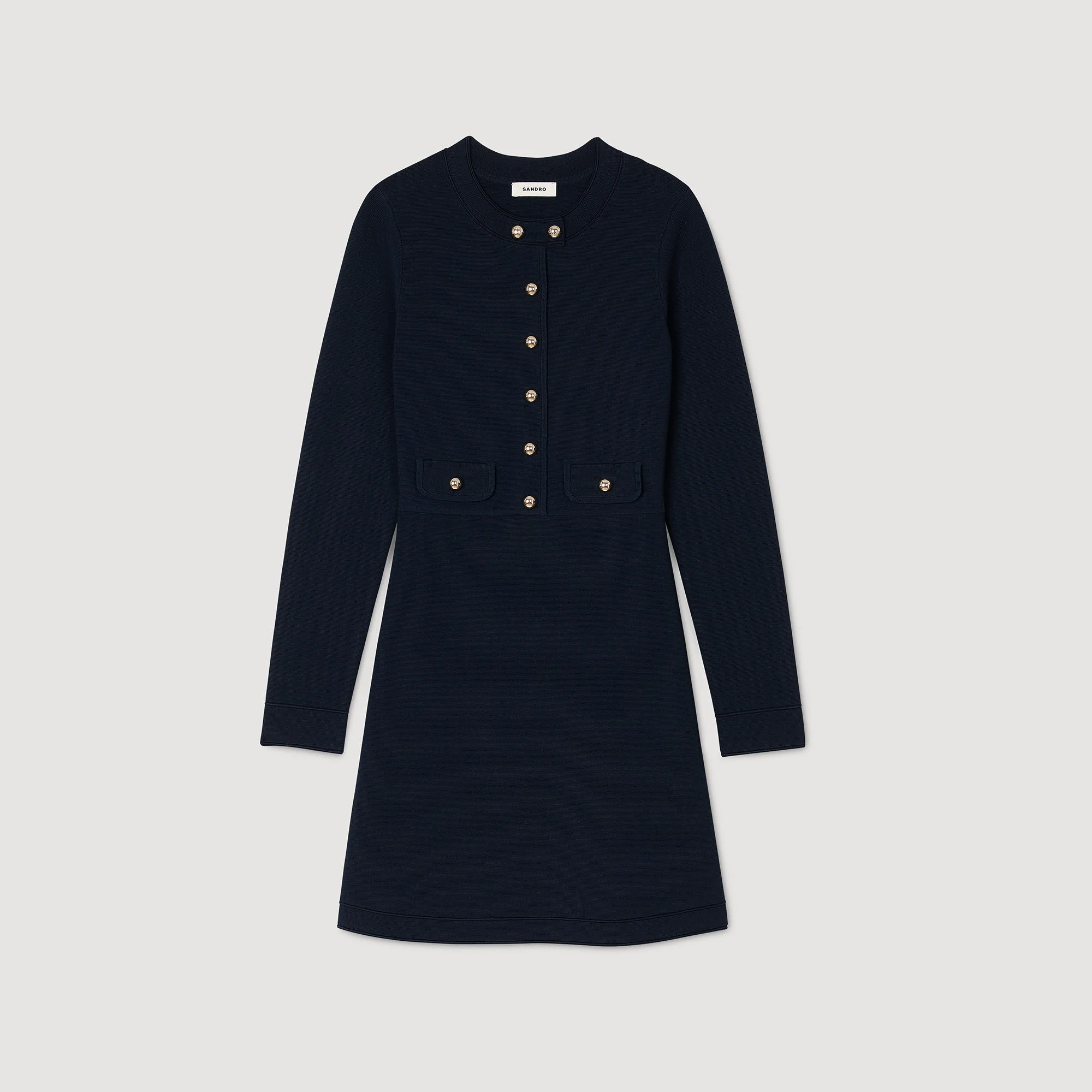 Mini knit dress with round neck, long sleeves, button placket and flap pockets. - Sandro Women's mini knit dress - Round neck - Button placket - 2 flap pockets with decorative button - Designed for a slim-fit Reference: SFPRO04070_44 COMPOSITION & CARE Composition - Main fabric: 53% viscose, 45% polyamide, 2% elastane - Tab: 53% viscose, 45% polyamide, 2% elastane - Pocket: 53% viscose, 45% polyamide, 2% elastane - Wrist: 53% viscose, 45% polyamide, 2% elastane - Bottom: 53% viscose, 45% polyamide, 2% elastane - Belt: 52% viscose, 46% polyamide, 2% elastane - Collar: 52% viscose, 46% polyamide, 2% elastane Care advice - Hand wash - Do not bleach - Do not tumble dry - Iron at a maximum temperature of 110°C without steam - F - Professional dry clean, with hydrocarbon solvent, normal treatment