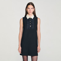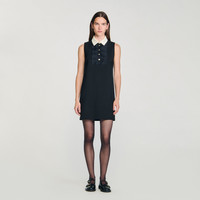 Reference: SFPRO04410_20 COMPOSITION & CARE Composition - Main material: 91% polyester, 9% elastane - Lining: 100% polyester - Collar: 100% viscose - Secondary material: 100% viscose Care advice - Do not wash - Do not bleach - Do not tumble dry - Iron at a maximum temperature of 110°C without steam - F/ - Professional dry clean, with hydrocarbon solvent, gentle treatment