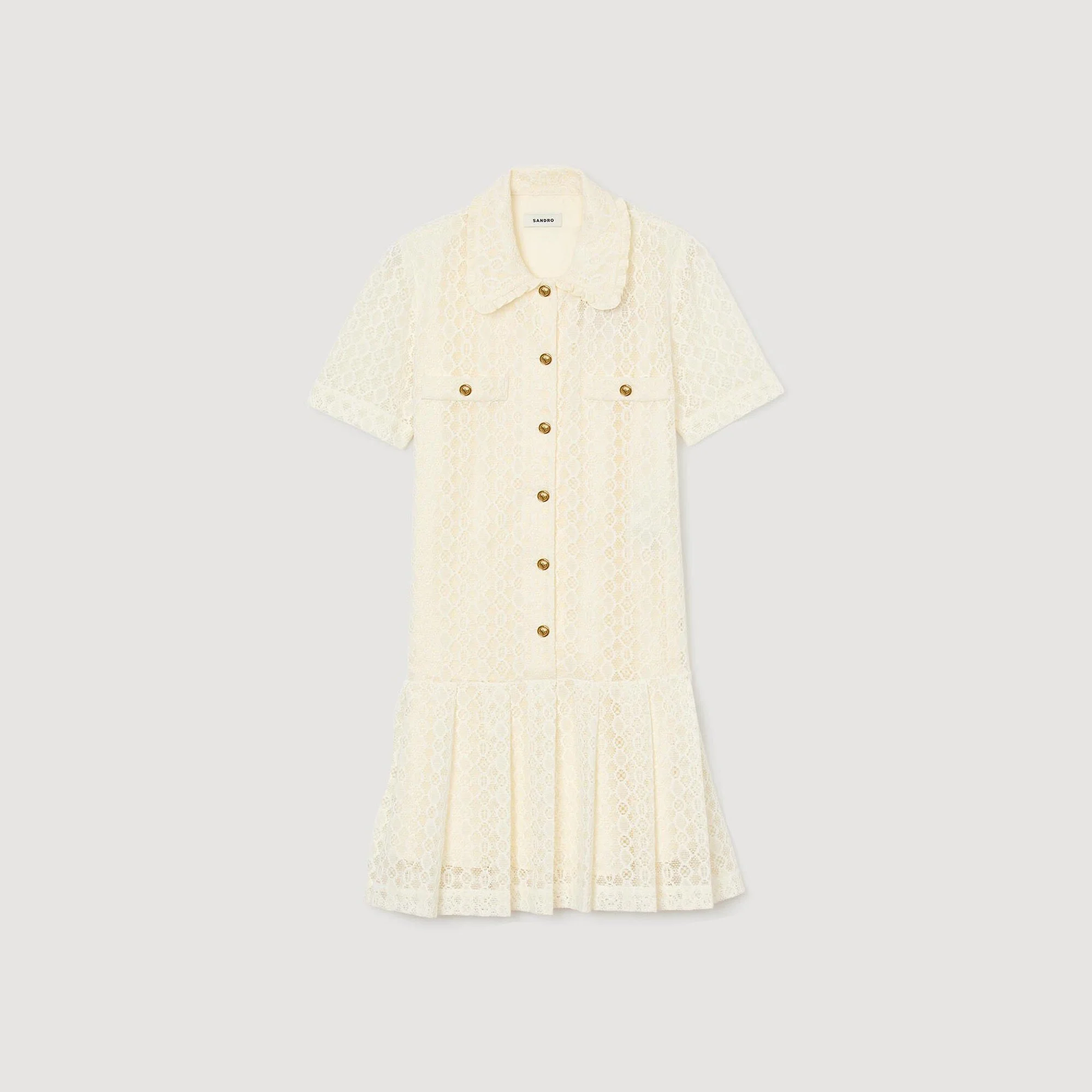 Mini lace dress with a shirt collar, button fastening and short sleeves. - Sandro Women's mini dress - Shirt collar - Short sleeves - Trim at collar - Mock welt pockets with buttons at chest - Lined - True to size Reference: SFPRO04428_11 COMPOSITION & CARE Composition - Main material: 100% polyester - Lining: 100% polyester Care advice - Regular cycle 30° - Do not bleach - Do not tumble dry - Do not iron - F/ - Professional dry clean, with hydrocarbon solvent, gentle treatment