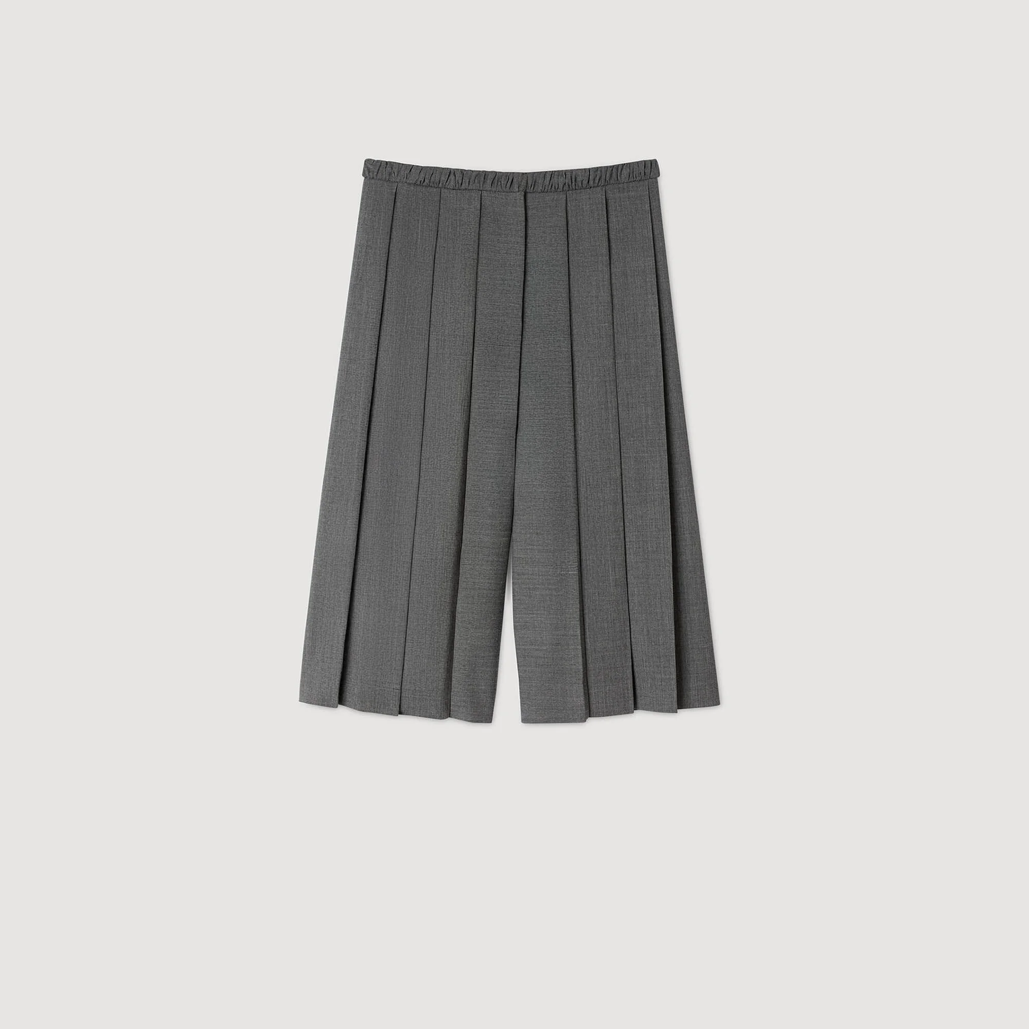 Long, wide pleated shorts with a smocked elasticated waistband. - Sandro Women's pleated shorts - Mid-rise waist - Flared cut - Zip fastening with hook and button - Designed for a flared fit Reference: SFPSH00512_24 COMPOSITION & CARE Composition - Main material: 54% polyester, 44% virgin wool, 2% elastane Care advice - Regular cycle 30° - Do not bleach - Do not tumble dry - Iron at a maximum temperature of 110°C without steam - F/ - Professional dry clean, with hydrocarbon solvent, gentle treatment