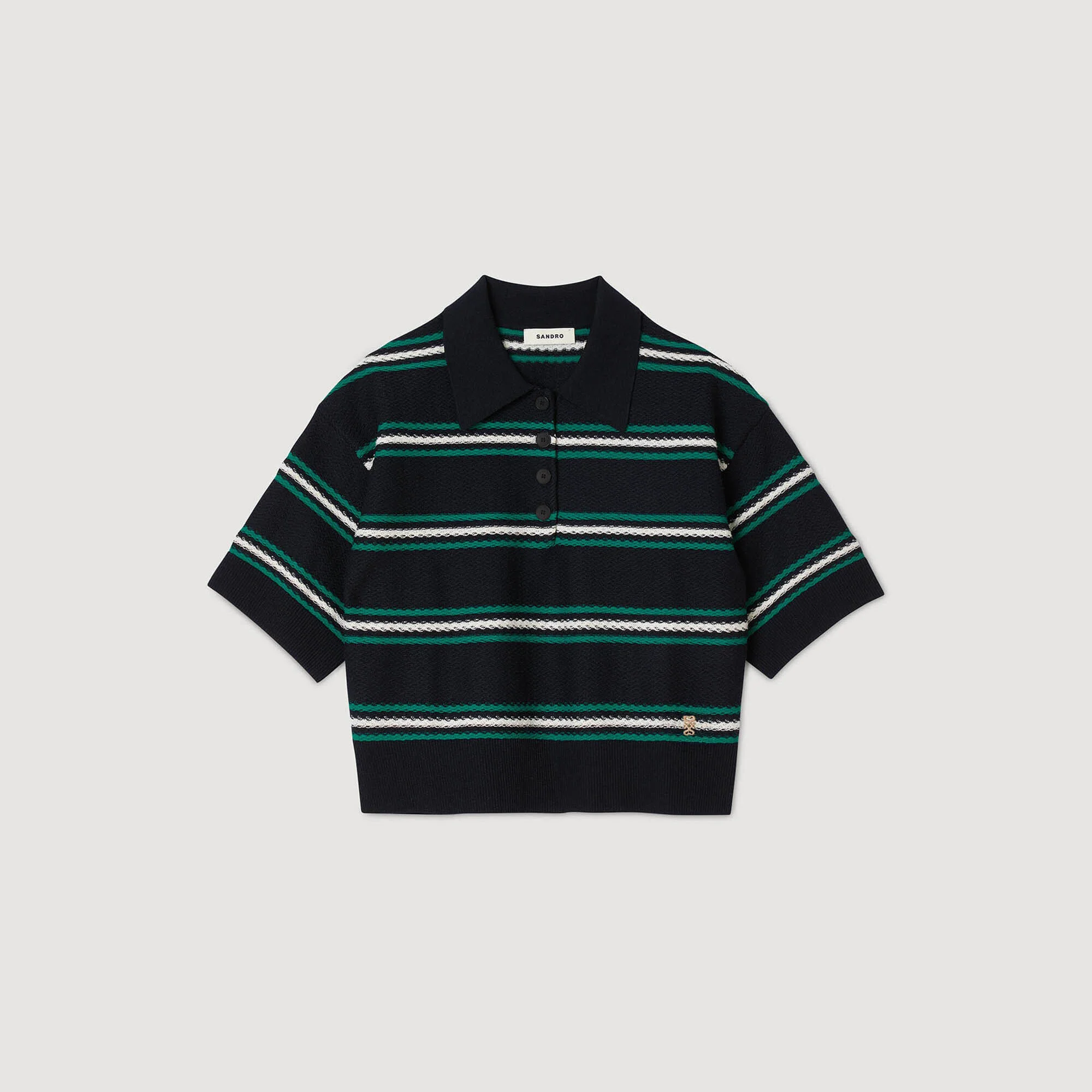 Short fine-knit striped sweater with buttoned polo collar and short sleeves. - Sandro Women's short knit sweater - Buttoned polo collar - Stripes - Short sleeves - Designed for a boxy fit Reference: SFPPU02677_44 COMPOSITION & CARE Composition - Main fabric: 74% viscose, 14% polyester, 12% linen - Collar: 49% viscose, 34% polyamide, 10% polyester, 7% linen Care advice - Hand wash - Do not bleach - Do not tumble dry - Iron at a maximum temperature of 110°C without steam - F - Professional dry clean, with hydrocarbon solvent, normal treatment
