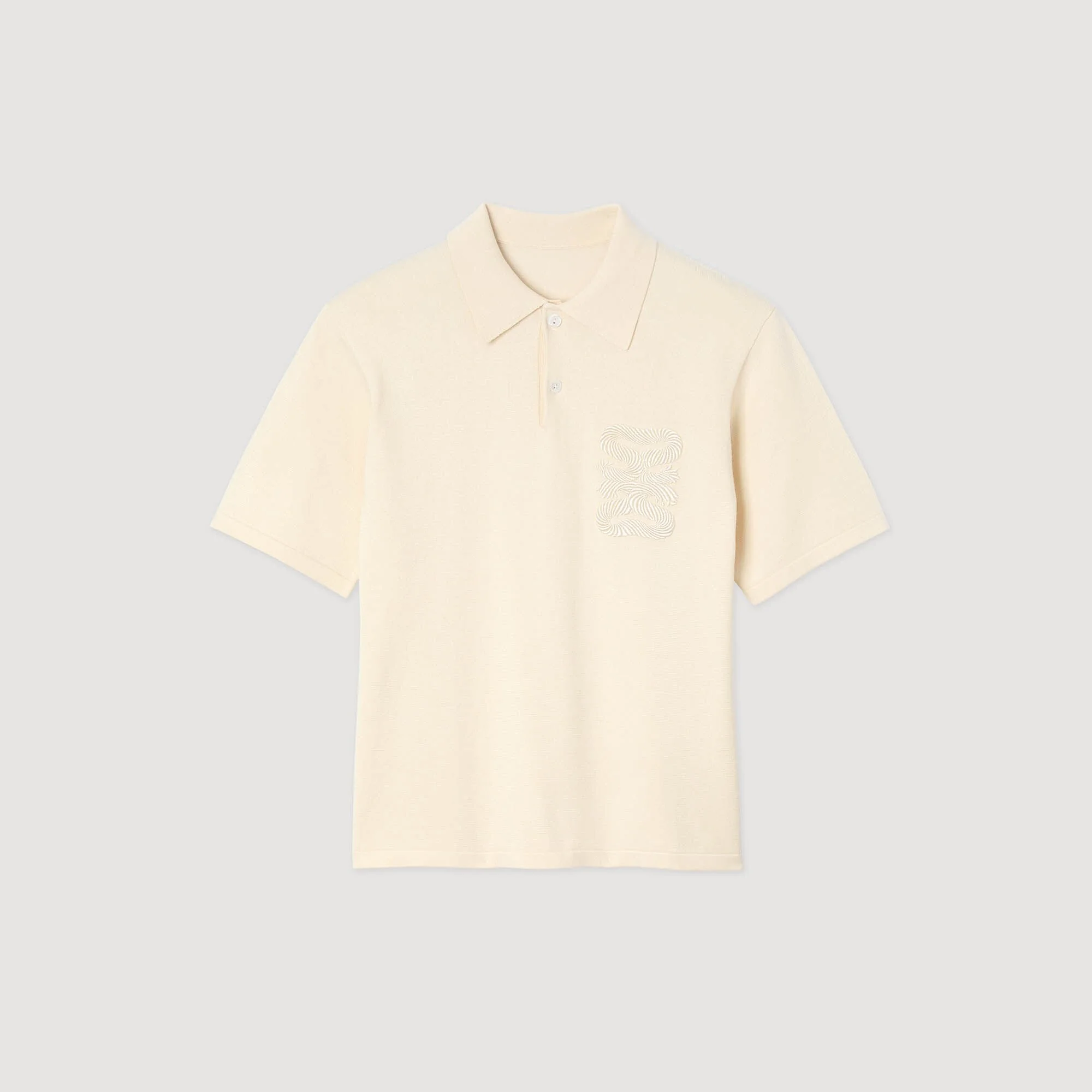 Fine knit polo shirt with polo collar, short sleeves and signature rope embroidery on the chest. - Sandro Men's knit polo shirt - Classic fit - Button-up polo collar - Short sleeves - 4S rope chest embroidery - True to size Reference: SHPTR00696_A450 COMPOSITION & CARE Composition - Main fabric: 64% viscose, 36% polyamide Care advice - Hand wash - Do not bleach - Do not tumble dry - Iron at a maximum temperature of 110°C without steam - F - Professional dry clean, with hydrocarbon solvent, normal treatment