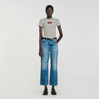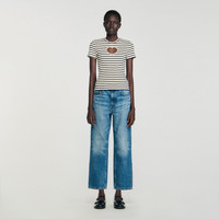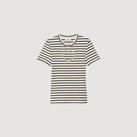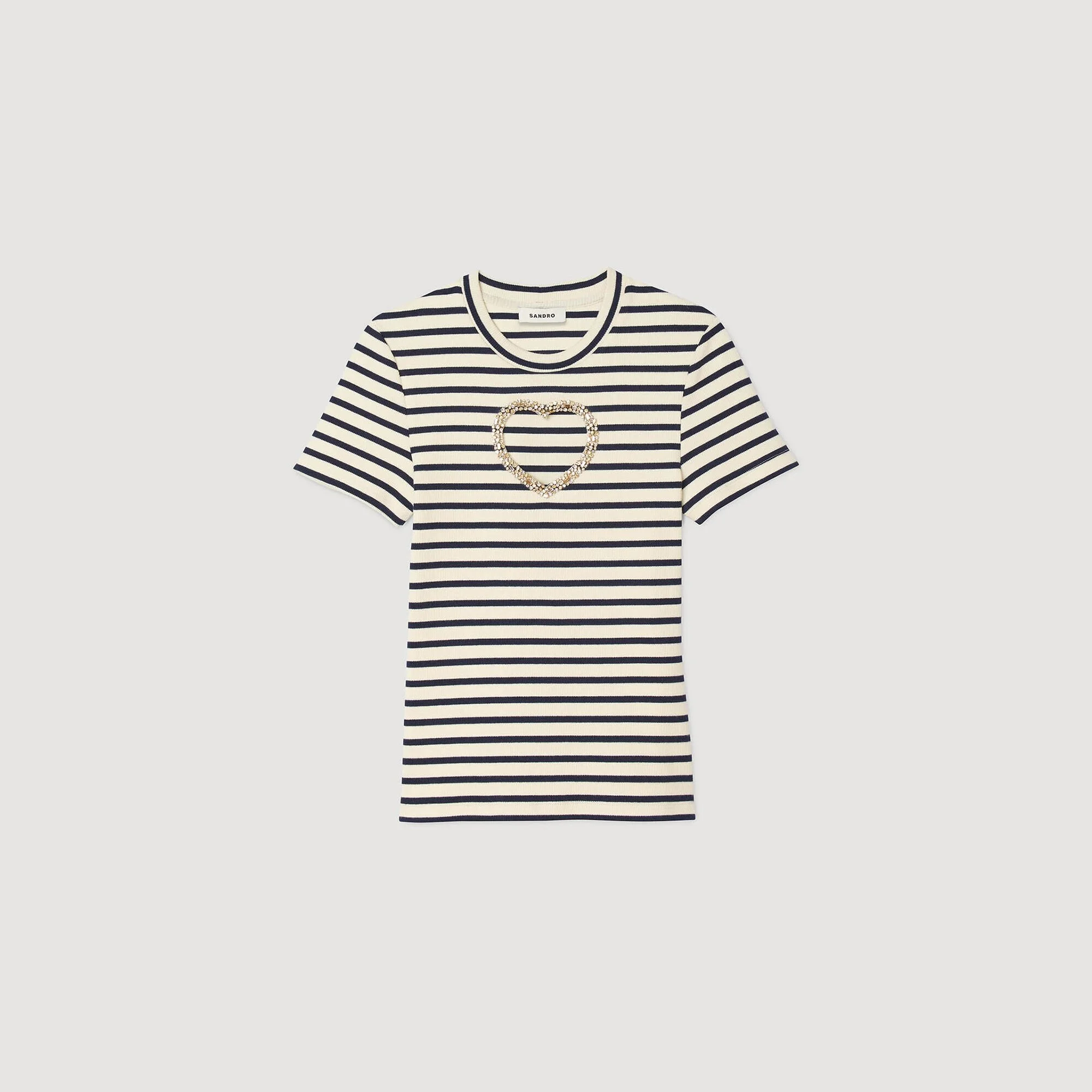Striped T-shirt with round neck and short sleeves, featuring an openwork heart with rhinestones - Sandro Women's striped T-shirt - Round neck - Short sleeves - Openwork heart with rhinestones Reference: SFPTS01713_11 COMPOSITION & CARE Composition - Main material: 97% cotton, 3% elastane Care advice - Hand wash - Do not bleach - Do not tumble dry - Iron at a maximum temperature of 110°C without steam - Do not dry clean