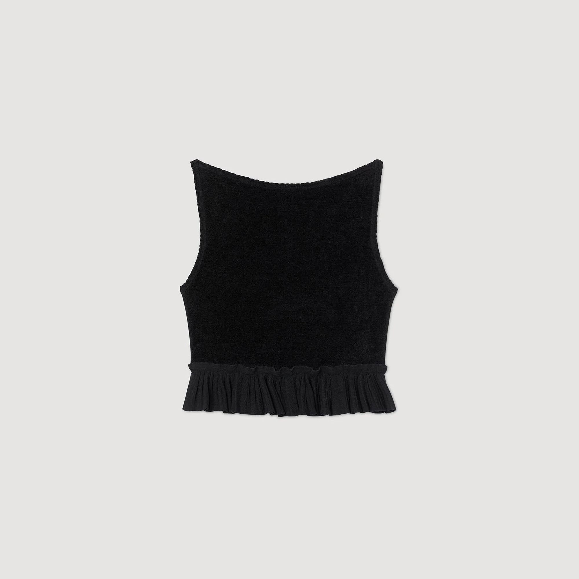 Reference: SFPPU02724_20 COMPOSITION & CARE Composition - Main fabric: 49% viscose, 46% polyamide, 4% polyester, 1% elastane - Ruffle: 53% viscose, 37% polyamide, 9% polyester, 1% elastane - Band: 53% polyamide, 45% viscose, 2% elastane Care advice - Hand wash - Do not bleach - Do not tumble dry - Iron at a maximum temperature of 110°C without steam - F - Professional dry clean, with hydrocarbon solvent, normal treatment